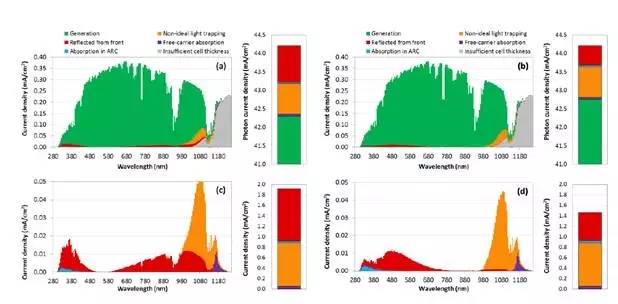 IBC電池單層膜(a,c)及多層膜(b,d)的光學損失分布圖