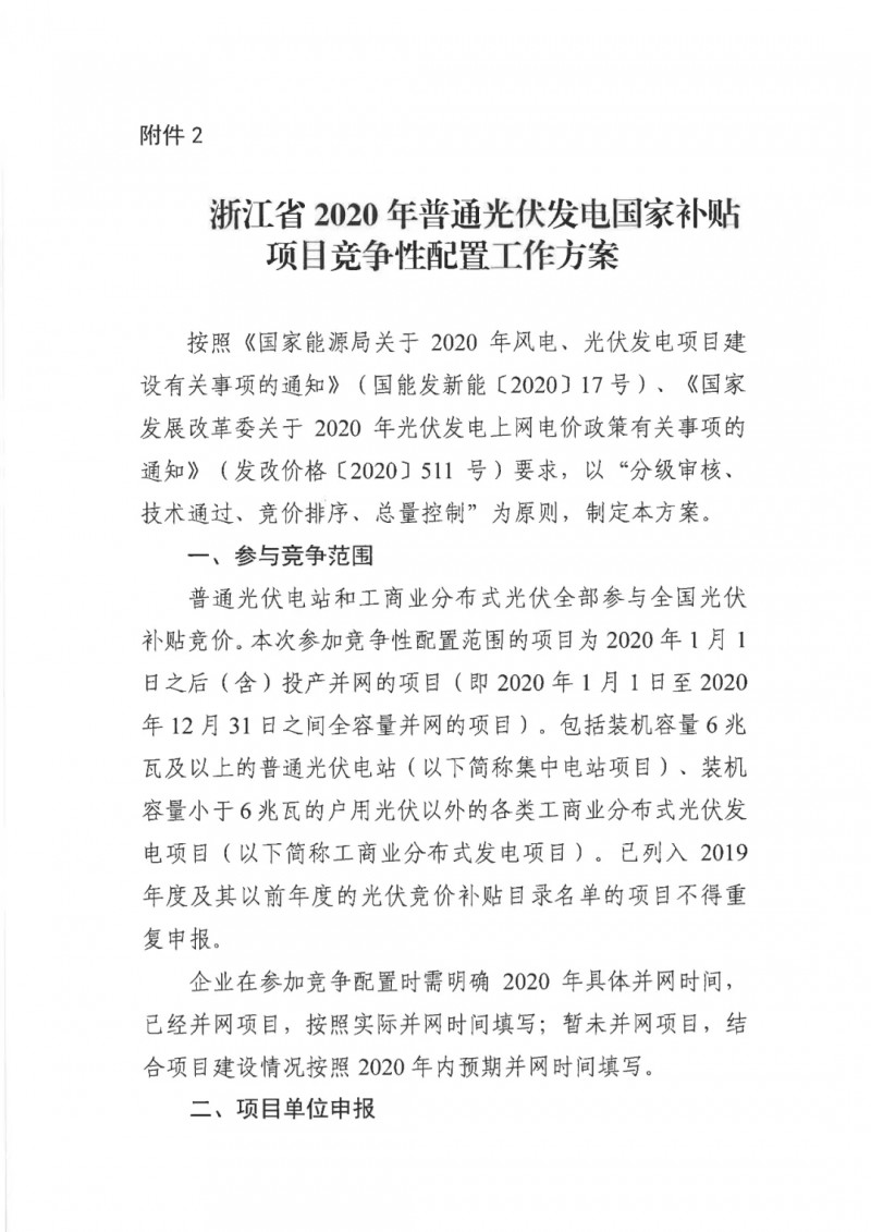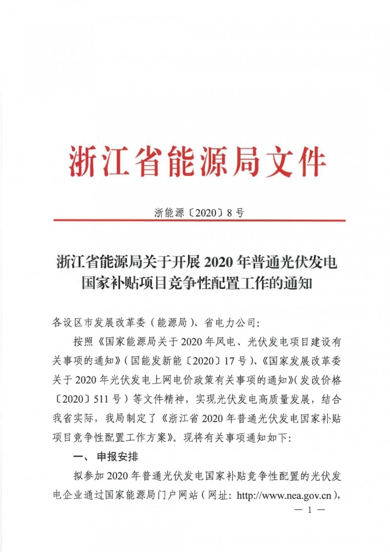 浙江發(fā)布2020年光伏發(fā)電國家補貼競爭性配置工作的通知