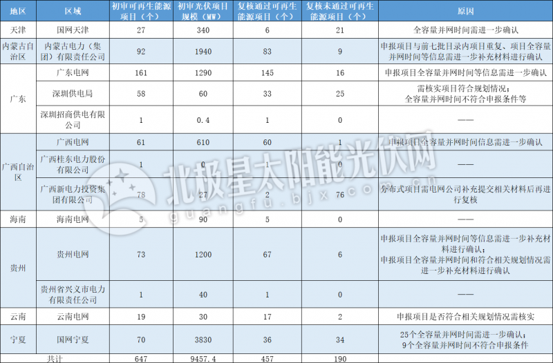 項目復(fù)核未通過原因:申報項目與前七批目錄內(nèi)項目重復(fù)、項目全容量并網(wǎng)時間等信息需進(jìn)一步補(bǔ)充材料進(jìn)行確認(rèn)。