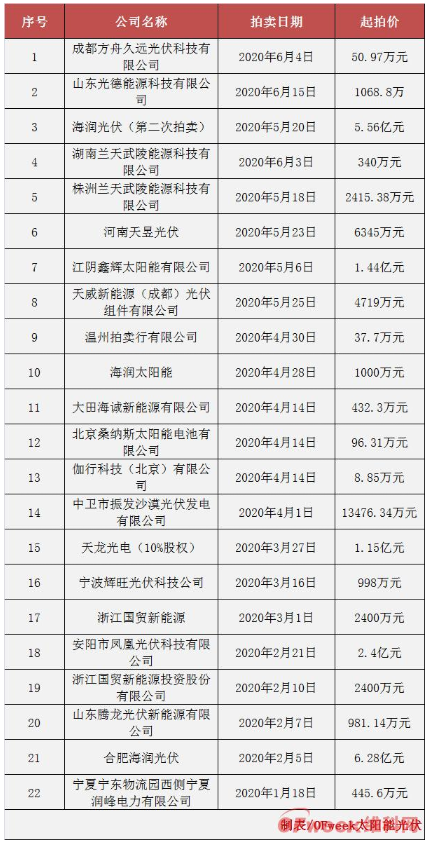 事實(shí)上,2020年開(kāi)年至今,類(lèi)似上述拍賣(mài)的消息從未間斷,據(jù)OFweek太陽(yáng)能光伏不完全統(tǒng)計(jì),截至上半年,累計(jì)拍賣(mài)的企業(yè)超出20家之多。