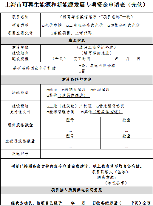 二)項(xiàng)目投資主體在項(xiàng)目并網(wǎng)投產(chǎn)后一年以?xún)?nèi),向項(xiàng)目所在地的區(qū)發(fā)展改革委提交獎(jiǎng)勵(lì)項(xiàng)目申報(bào)申請(qǐng)。戶(hù)用光伏采取打捆的方式,由各供電公司向戶(hù)用光伏所在區(qū)發(fā)展改革委代為申報(bào)。
