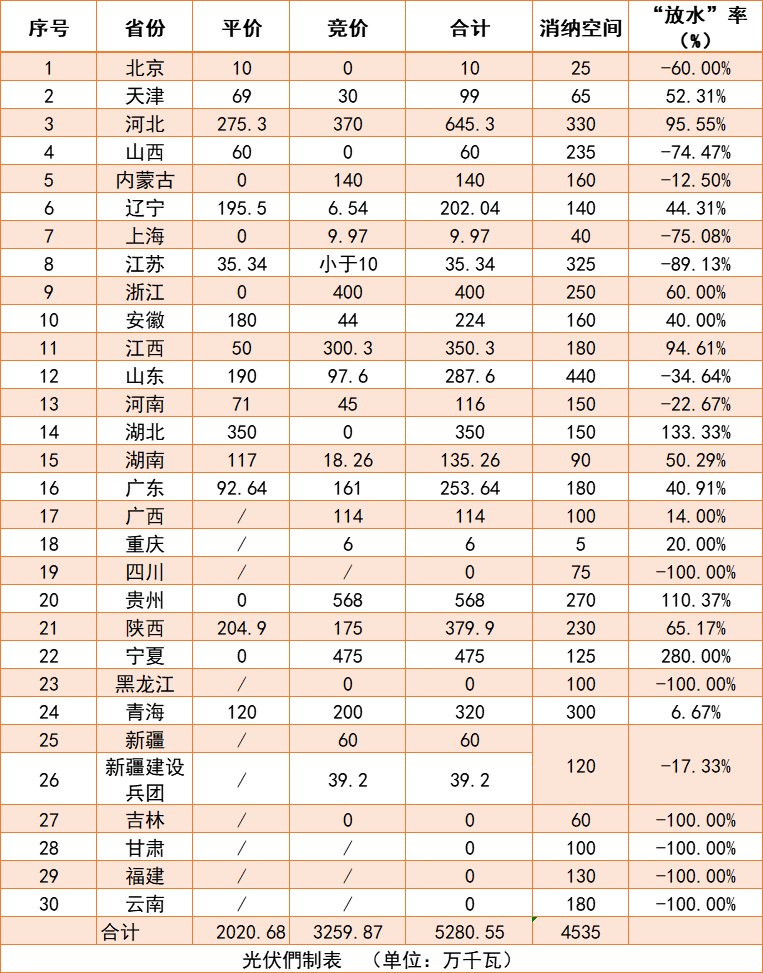 從上表數(shù)據(jù)可以看出,河北、江西、寧夏等省份的競(jìng)價(jià)規(guī)模遠(yuǎn)超電網(wǎng)公司給出的2020年新增光伏消納空間。
