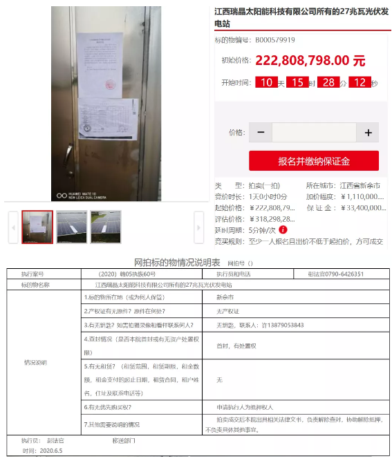 據(jù)世紀(jì)新能源網(wǎng)了解,該標(biāo)的物為江西瑞晶太陽能科技有限公司所有,當(dāng)事人議價為31829.8282萬元,而起拍價則為22280.8798萬元,按照起拍價計算相當(dāng)于8.25元/W。該標(biāo)的物將于2020年6月25日10時至2020年6月26日10時止開始拍賣。