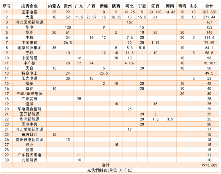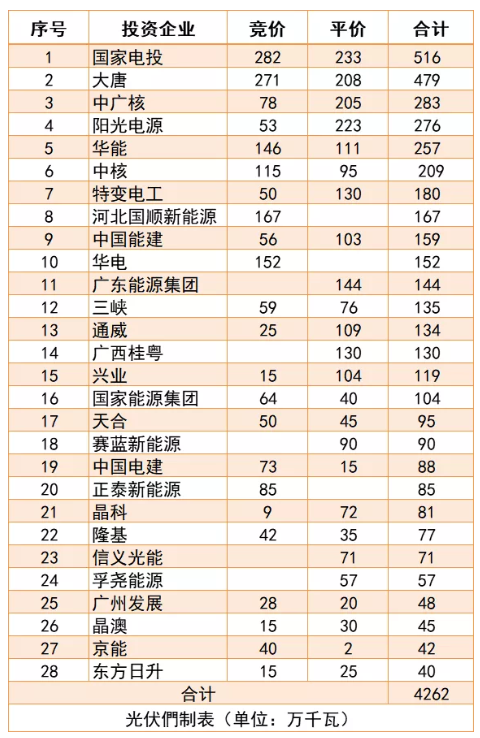 根據(jù)統(tǒng)計,目前公布的名單競/平價合計超過60GW,遼寧、四川、云南和山西等省份還將有超過5GW的光伏規(guī)模等待競爭。光伏們梳理了部分裝機規(guī)模較大的投資商名單,以分析今年光伏電站投資主體的變化。