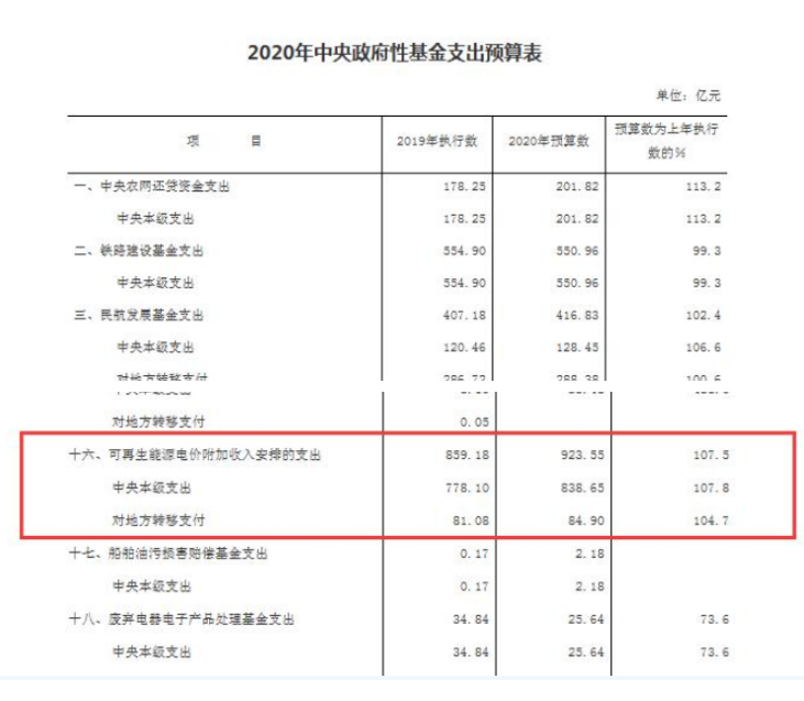 財(cái)政部公布《2020年中央財(cái)政預(yù)算》,2020年可再生能源電價(jià)附加收入預(yù)算883.52億元,2020年可再生能源電價(jià)附加支出預(yù)算數(shù)923.55億元。