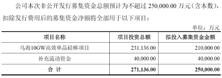 公司本次非公開(kāi)發(fā)行募集資金總額預(yù)計(jì)為不超過(guò)25億元,扣除發(fā)行費(fèi)用后的募集資金凈額將全部用于烏海10GW高效單晶硅棒項(xiàng)目和補(bǔ)充流動(dòng)資金。項(xiàng)目建設(shè)地點(diǎn)位于內(nèi)蒙古自治區(qū)烏海市海勃灣工業(yè)園區(qū),建設(shè)期為2年,實(shí)施主體為烏海市京運(yùn)通新能源有限公司。