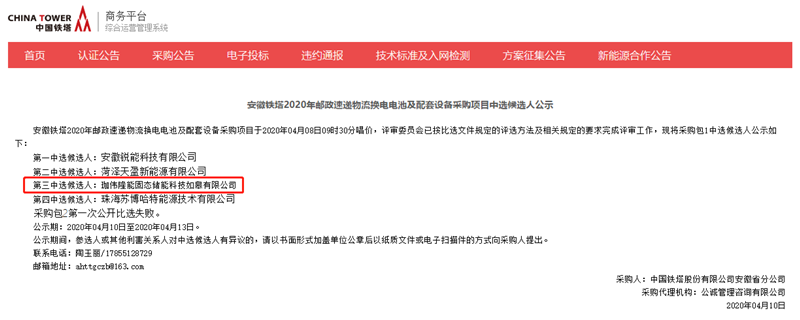 珈偉新能入圍中國(guó)鐵塔安徽分公司電池招標(biāo)項(xiàng)目