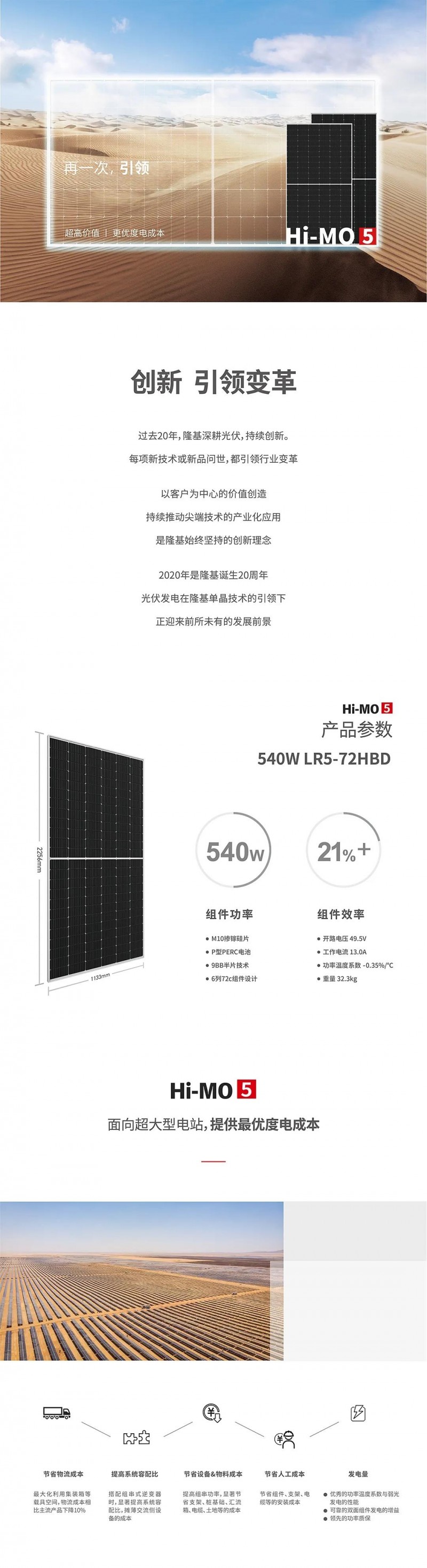 隆基本次發(fā)布72型與66型兩種規(guī)格的Hi-MO5產(chǎn)品。其中,66型組件的正面功率為495W,能夠靈活適用更多場景。同時,隆基2019年推出的Hi-MO 4,作為現(xiàn)有產(chǎn)能中最具競爭力的產(chǎn)品,適用于戶用、工商業(yè)分布式系統(tǒng)及地面電站,將與Hi-MO5一起,進(jìn)一步滿足客戶多元化的應(yīng)用場景。