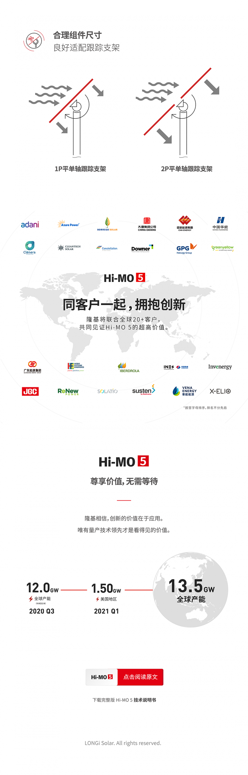 在進(jìn)入光伏領(lǐng)域以來,隆基矢志不渝的推動產(chǎn)業(yè)化進(jìn)度。5年來,隆基通過業(yè)績矚目的量產(chǎn)速度推動單晶技術(shù)成為市場主流,實(shí)現(xiàn)大型電站的雙面化技術(shù)趨勢,引領(lǐng)組件高功率時代。此次,為了滿足全球客戶對超高功率產(chǎn)品的需求,Hi-MO5產(chǎn)品也將以“隆基效率”迅速實(shí)現(xiàn)大規(guī)模量產(chǎn),今年第三季度產(chǎn)能即可達(dá)到12GW。明年一季度,Hi-MO5還將在東南亞實(shí)現(xiàn)量產(chǎn),滿足美國客戶需求。