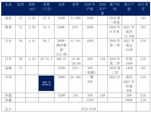 超高功率產(chǎn)品的主要硅片型號(hào),將集中在182和210兩類上,其中210的主要組件廠商為中環(huán)股份、東方環(huán)晟、天合光能、東方日升、協(xié)鑫集成等。182、180路線的廠商包括晶科能源、隆基股份、晶澳科技等。