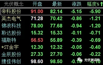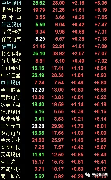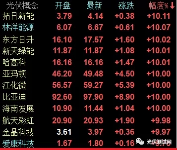 全部260只光伏概念股中,漲停的超過12支,僅有8支股票下跌,漲幅超過5%的超過40支。
