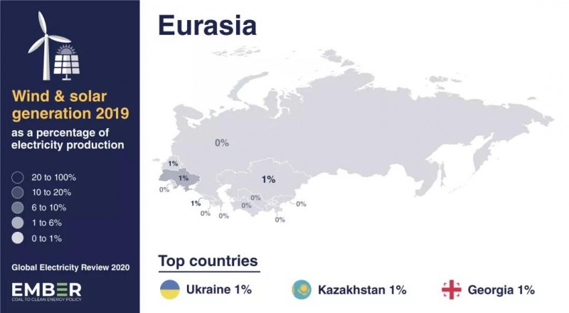 歐亞大陸顯然與世界其他地區(qū)格格不入。俄羅斯是世界上第四大電力需求國,風(fēng)能和太陽能僅占其總量的0.1%。烏克蘭處于相對領(lǐng)先地位,并且在2019年發(fā)電量大增,建設(shè)了4GW的太陽能發(fā)電量,使其風(fēng)能和太陽能發(fā)電機(jī)組的規(guī)模翻了一番,占比達(dá)到1%。
