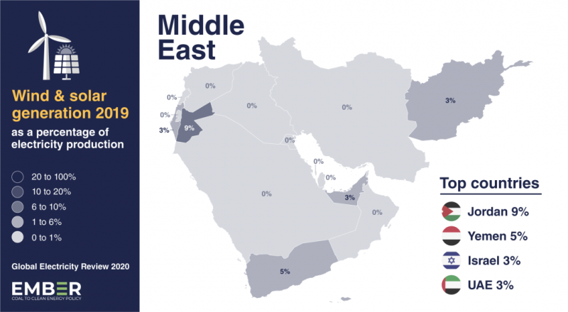 中東只有1%的電力來自風(fēng)能和太陽能,遠(yuǎn)遠(yuǎn)落后于世界其他地區(qū)。主要國家是約旦(9%)、也門(5%)、以色列(3%)和阿拉伯聯(lián)合酋長國(3%);處于更落后狀態(tài)的國家包括伊朗(0.4%)、沙特阿拉伯(0.2%)和伊拉克(0.1%)。2019年,中東地區(qū)太陽能發(fā)電規(guī)模擴(kuò)大,阿聯(lián)酋增加了1.3千兆瓦的太陽能發(fā)電量;沙特阿拉伯和以色列在2019年分別新增0.3和0.4吉瓦