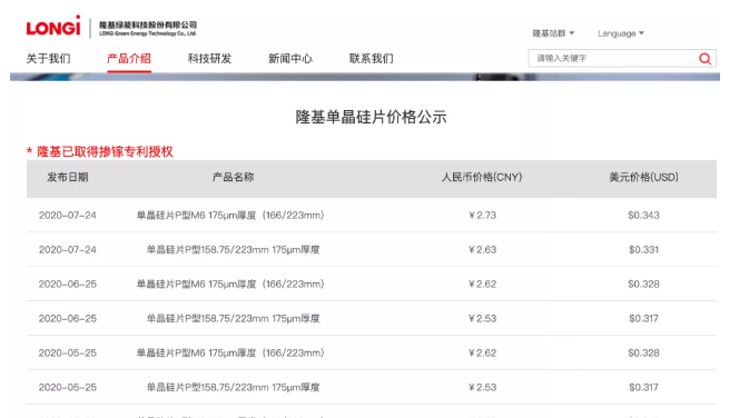 7月24日,隆基發(fā)布“單晶硅片價格公示,單晶硅片P型M6 175μm厚度(166/223mm)2.73元,照比上次公布價格上漲0.11元,單晶硅片P型158.75/223mm 175μm厚度2.63元,照比上次價格上漲0.10元。