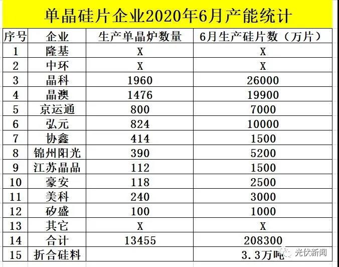 之前單晶致密料價(jià)格跌破60到58元/公斤,最低時(shí)鑄造多晶硅價(jià)格也到了26-27元/公斤,這個(gè)價(jià)格比一些多晶硅企業(yè)的現(xiàn)金成本還低,因此大部分多晶硅企業(yè)紛紛停產(chǎn)減產(chǎn)。小編對(duì)多晶硅企業(yè)2020年6月的產(chǎn)能與硅片企業(yè)6月的產(chǎn)能做了一個(gè)調(diào)研。2020年6月,全球多晶硅企業(yè)的實(shí)際產(chǎn)量在3.37萬噸左右,其中2.9萬噸單晶用料,0.47萬噸鑄錠用料。調(diào)研中還發(fā)現(xiàn),國(guó)內(nèi)多晶硅企業(yè)只有通威、亞洲硅業(yè)在滿產(chǎn),即便協(xié)鑫、大全、特變、東方希望都沒有滿產(chǎn),而國(guó)外多晶硅企業(yè)僅僅只有瓦克開了50%左右的產(chǎn)能,其余多晶硅巨頭如韓國(guó)OCI、馬來西亞OCI、挪威Elkem等都已經(jīng)停產(chǎn)。因此,即便國(guó)內(nèi)兩家多晶硅巨頭發(fā)生事故不能滿產(chǎn),只要其余多晶硅廠家滿產(chǎn),就可以馬上滿足硅片企業(yè)對(duì)多晶硅的需求。