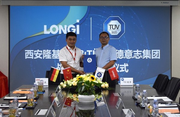 TUV南德許海亮先生(右)與隆基綠建鐘朋格先生簽署協(xié)議