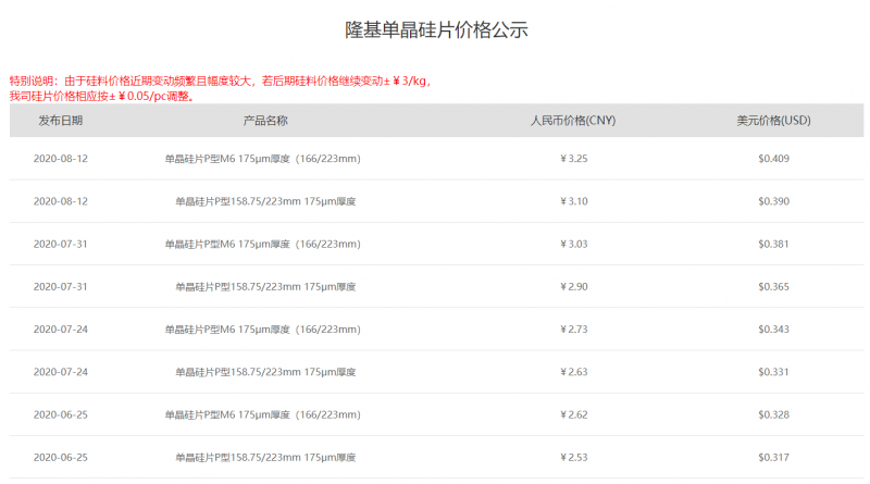 8月12日,在通威單晶電池漲價(jià)9%兩天過(guò)后,隆基股份宣布上調(diào)硅片價(jià)格。其中,158.75mm硅片價(jià)格上調(diào)0.2元/片,報(bào)價(jià)2.90元,漲幅7.4%;166mm硅片價(jià)格上調(diào)0.22元/片,報(bào)價(jià)3.25元,漲幅7.3%。
