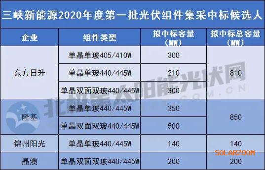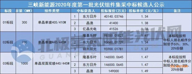 根據(jù)招標(biāo)公告,三峽組件招標(biāo)共分3個(gè)標(biāo)段,01標(biāo)段為單晶單玻405/410W標(biāo)段,入圍1個(gè)供應(yīng)商,第一中標(biāo)候選人為東方日升; 02標(biāo)段為單晶單玻440/445W,入圍3個(gè)供應(yīng)商,隆基、東方日升、錦州陽(yáng)光分別獲得50%、30%、20%份額; 03標(biāo)段為單晶雙玻440/445W,入圍3個(gè)供應(yīng)商,隆基、東方日升、晶澳將分別獲得50%、30%、20%份額。