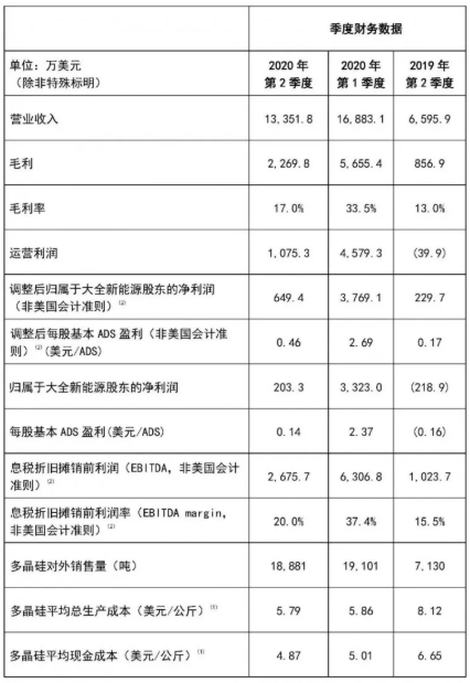 【公告主要內(nèi)容】 8月18日,大全新能源發(fā)布2020年第2季度業(yè)績(jī)公告,要點(diǎn)如下: