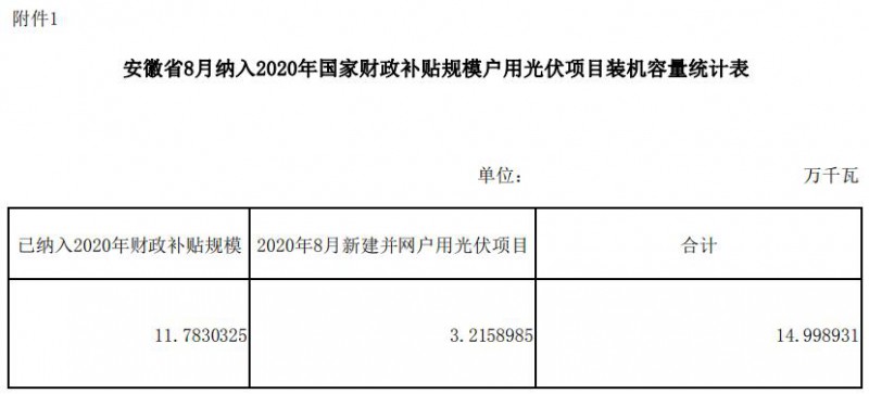 安徽省8月納入2020年國(guó)家財(cái)政補(bǔ)貼規(guī)模戶用光伏項(xiàng)目名單