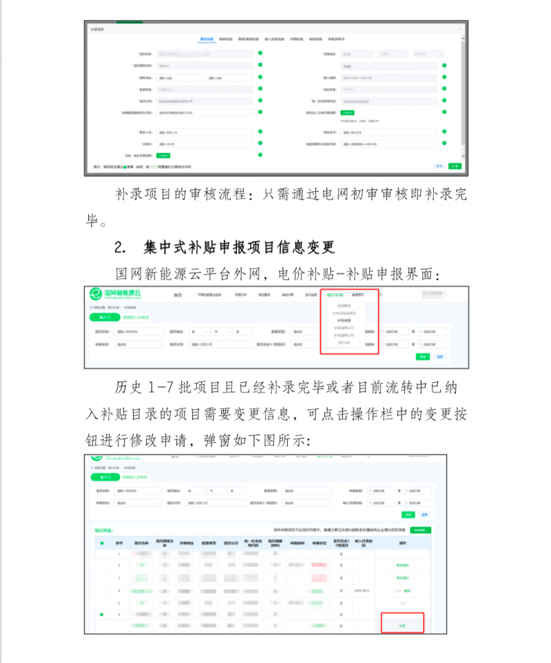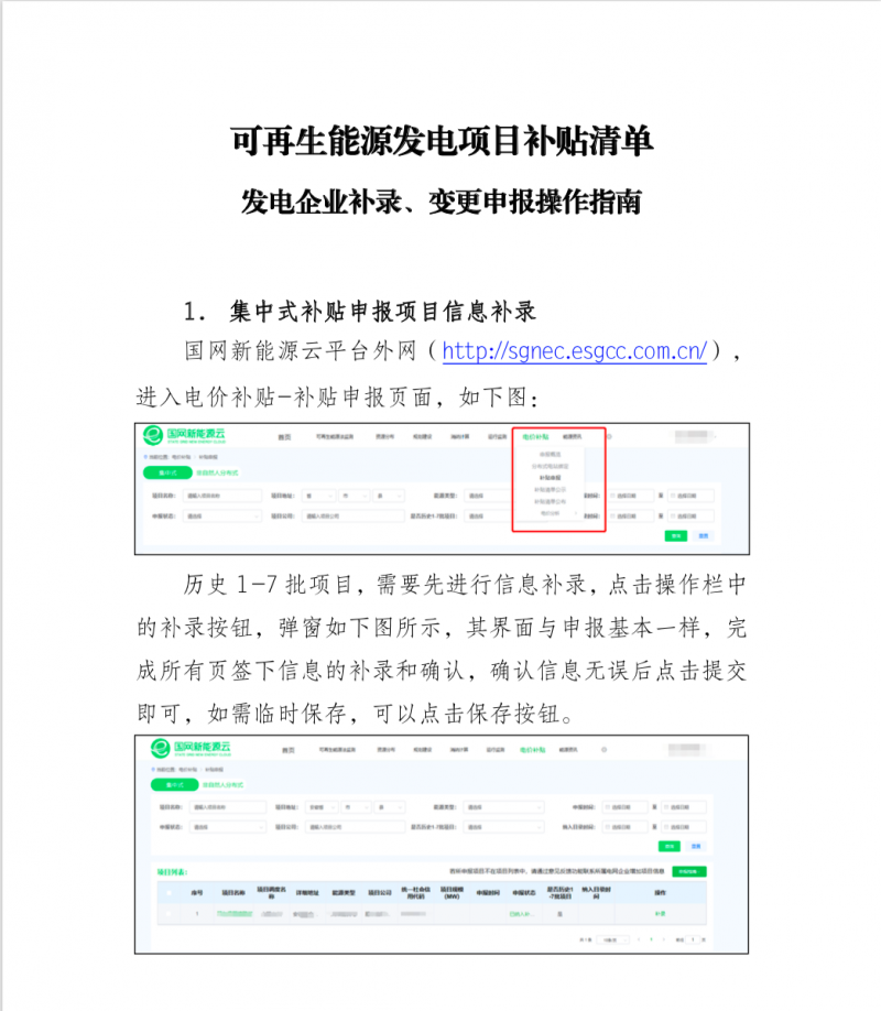 對于已納入1-7批補貼目錄項目,如項目名稱、業(yè)主、容量、場址發(fā)生變更,項目業(yè)主可通過國網(wǎng)新能源云平臺(網(wǎng)址:http://sgnec.esgcc.com.cn)開展目錄項目信息變更工作。其中,項目名稱、業(yè)主信息變更,由各省電力公司審核后進(jìn)行公示、公布;項目容量、場址信息變更,需重新申報納入補貼清單。用戶操作手冊詳見附件。