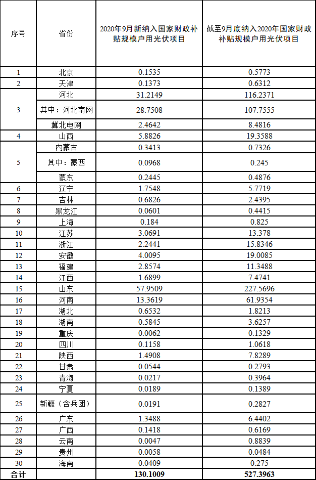 根據(jù)各省級(jí)能源主管部門(mén)、電網(wǎng)企業(yè)報(bào)送信息,經(jīng)國(guó)家可再生能源信息管理中心梳理統(tǒng)計(jì),2020年9月新納入國(guó)家財(cái)政補(bǔ)貼規(guī)模戶(hù)用光伏項(xiàng)目總裝機(jī)容量為130.1萬(wàn)千瓦。截至2020年9月底,全國(guó)累計(jì)納入2020年國(guó)家財(cái)政補(bǔ)貼規(guī)模戶(hù)用光伏項(xiàng)目裝機(jī)容量為527.4萬(wàn)千瓦。詳細(xì)情況見(jiàn)附表。