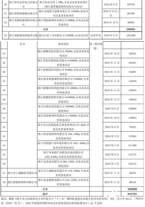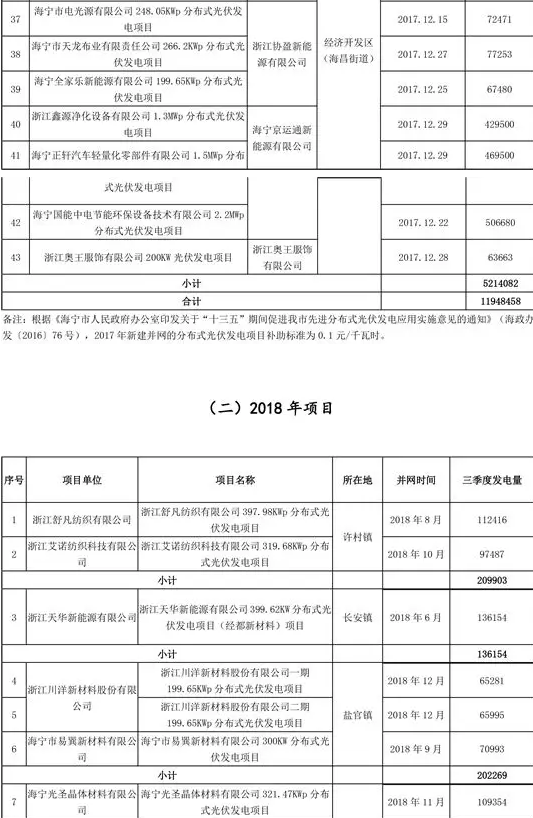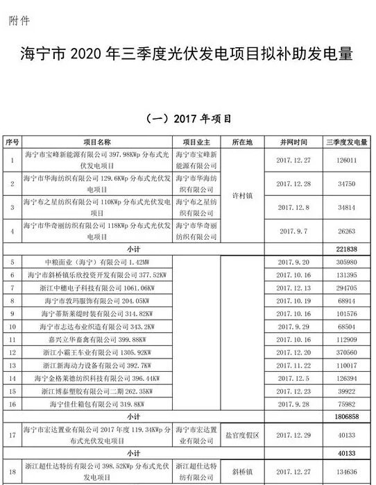 浙江海寧市公示2020年三季度光伏發(fā)電項(xiàng)目擬補(bǔ)助發(fā)電量