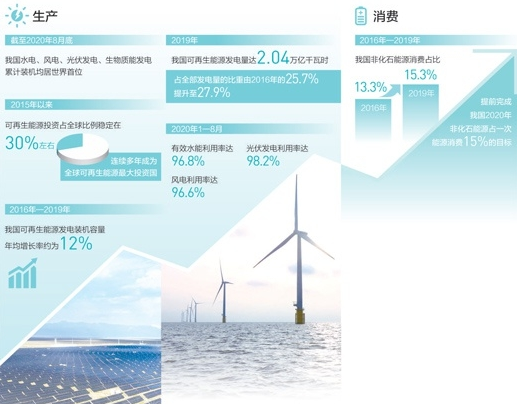 利用水平不斷提升。2019年,我國可再生能源發(fā)電量達(dá)2.04萬億千瓦時(shí),占全部發(fā)電量的比重由2016年的25.7%提升至27.9%。今年1—8月,有效水能利用率達(dá)96.8%、風(fēng)電利用率達(dá)96.6%、光伏發(fā)電利用率達(dá)98.2%。