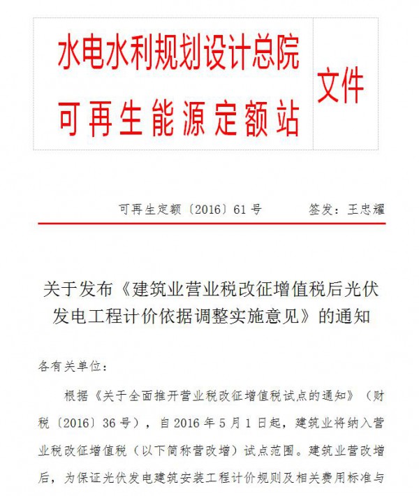 根據(jù)《關(guān)于全面推開營業(yè)稅改征增值稅試點(diǎn)的通知》(財(cái)稅〔2016〕36號(hào)),自2016年5月1日起,建筑業(yè)將納入營業(yè)稅改征增值稅(以下簡稱營改增)試點(diǎn)范圍。建筑業(yè)營改增后,為保證光伏發(fā)電建筑安裝工程計(jì)價(jià)規(guī)則及相關(guān)費(fèi)用標(biāo)準(zhǔn)與增值稅稅制相適應(yīng),現(xiàn)發(fā)布《關(guān)于建筑業(yè)營業(yè)稅改征增值稅后光伏發(fā)電工程計(jì)價(jià)依據(jù)調(diào)整實(shí)施意見》(以下簡稱本意見),