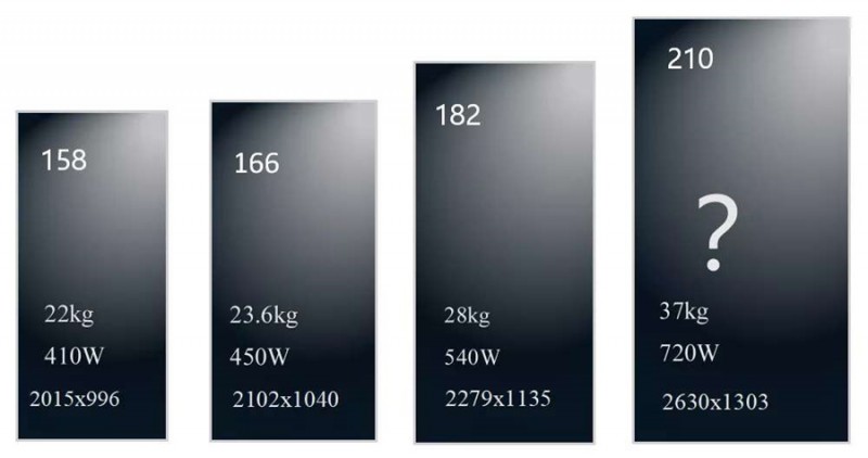 按這樣的邏輯,210硅片所對(duì)應(yīng)的組件應(yīng)該是720W?這樣的組件對(duì)應(yīng)尺寸已經(jīng)到了2. 6米長(zhǎng),1.3米寬,重量達(dá)到37kg,這與當(dāng)下的產(chǎn)業(yè)鏈配套顯然存在問(wèn)題。行業(yè)里也早已有共同的認(rèn)知:不要單純?yōu)榱颂岣呓M件功率把組件越做越大。