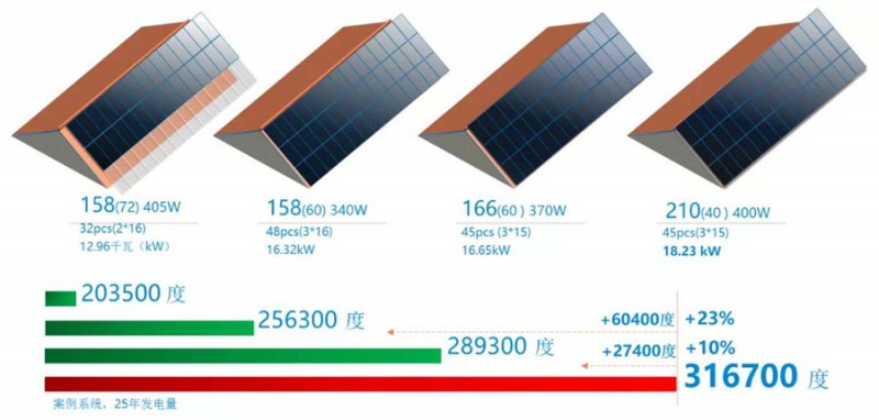 在這個(gè)案例下,使用210的400W小組件,裝機(jī)容量比158組件提高12%,比166組件提高10%,通過(guò)更大的裝機(jī)容量可以提高系統(tǒng)發(fā)電量,給用戶帶來(lái)每年更高的項(xiàng)目收益。