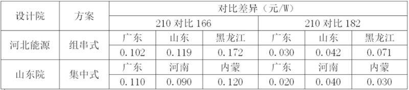 210產(chǎn)品的550W、600W以及660W,都是為大型地面電站設(shè)計(jì)的產(chǎn)品,目前進(jìn)入量產(chǎn)的型號(hào)是550W。我們搜集了河北能源工程設(shè)計(jì)院和山東電力工程咨詢?cè)簝杉覇挝粚?duì)于此款型號(hào)在不同緯度項(xiàng)目的系統(tǒng)造價(jià)差異對(duì)比結(jié)果,如下表: