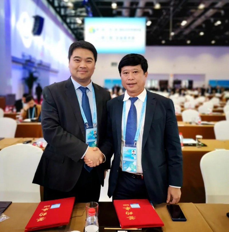 天合光能亞太電站創(chuàng)團(tuán)總經(jīng)理李鵬(左)與越南沱江集團(tuán)第十一股份公司董事長阮文山(右)合影