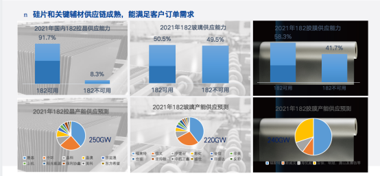 此外,在生產制造方面,得益于182產品配套的成熟,日前組件已經逐步進入量產階段。“182拉晶與158產品成晶率基本持平,后續(xù)還有一定提升空間,切片環(huán)節(jié)良率雖略低但很快將與158硅片達到持平狀態(tài),電池效率通過各環(huán)節(jié)優(yōu)化工藝可以提升至23.1%。目前組件量產效率已達到21%以上,運輸方面與158/166產品相比較,每個集裝箱可以多裝10%~20%瓦左右”,晶澳高級副總裁助理資深產品技術專家王夢松強調,更重要的是,182產品在拉晶、切片、電池、組件方面每道工序都有多個合格的供應商。預計2021年可供應182產品的拉晶、玻璃、膠膜產能“都在50%以上,拉晶占比更是高達91.7%。