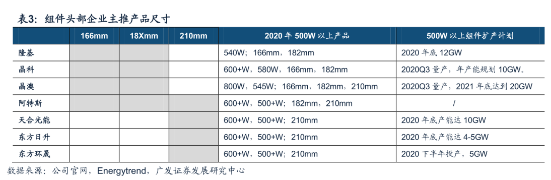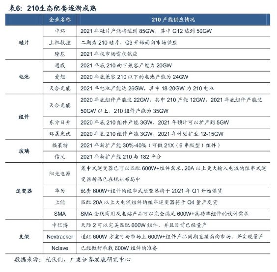 硅片方面,中環(huán)股份作為光伏硅片領(lǐng)域龍頭,最早于行業(yè)內(nèi)推出210尺寸硅片產(chǎn)品。目前公司共有硅片產(chǎn)能51GW,其中包括18GW的210硅片產(chǎn)能。預(yù)計(jì)2020年底公司硅片總產(chǎn)能將達(dá)到55GW,210尺寸產(chǎn)能達(dá)到19GW,2021年底公司硅片總產(chǎn)能預(yù)計(jì)達(dá)到85GW,其中G12達(dá)到50GW。上機(jī)數(shù)控2期8GW單晶硅片均為210尺寸產(chǎn)品,已經(jīng)于2020Q3面向市場供應(yīng)。2020年8月5日京運(yùn)通自主開發(fā)的210尺寸大硅片試產(chǎn)成功,開始進(jìn)行批量化生產(chǎn),此外,公司近日公告將在樂山建設(shè)24GW的210硅片產(chǎn)線,其中一期12GW拉棒、切方項(xiàng)目計(jì)劃2020年四季度開工,二期12GW拉棒、切方項(xiàng)目在一期項(xiàng)目達(dá)產(chǎn)后兩年內(nèi)投產(chǎn)。 電池方面:通威股份作為全球最大獨(dú)立第三方電池供應(yīng)企業(yè),眉山一期、眉山二期、金堂一期各7.5GW產(chǎn)能全面兼容210尺寸電池,眉山一期產(chǎn)能已經(jīng)于2020年4月投產(chǎn),眉山二期及金堂一期計(jì)劃分別于2021年4月及一季度投產(chǎn),屆時(shí)通威股份210尺寸電池產(chǎn)能將達(dá)到22.5GW。愛旭股份截至2020年上半年擁有電池產(chǎn)能約15GW,其中210產(chǎn)能約5GW,隨著義烏三、四、五及天津二期產(chǎn)能投產(chǎn),2020年底公司電池總產(chǎn)能22GW,其中210電池產(chǎn)能將達(dá)到10GW,2021Q1電池總產(chǎn)能36GW,其中210產(chǎn)能24GW。天合光能大尺寸電池主要匹配自身組件出貨需求,根據(jù)2020年中報(bào),公司預(yù)計(jì)在2021年底電池總產(chǎn)能達(dá)到26GW左右,其中210mm大尺寸電池產(chǎn)能占比達(dá)到70%左右。 組件方面:天合光能作為全球組件龍頭,公司2020年中報(bào)顯示,在2020年底組件總產(chǎn)能預(yù)計(jì)能達(dá)到22GW左右,2021年底組件總產(chǎn)能預(yù)計(jì)能達(dá)到50GW左右,2021年組件出貨量預(yù)計(jì)30-35GW,其中210尺寸產(chǎn)品出貨約26GW。東方日升截至2020年上半年組件產(chǎn)能12.6GW,公司預(yù)計(jì)2021年210組件出貨量5GW左右。 玻璃方面:目前210出貨以500W/545W產(chǎn)品為主,這兩款組件產(chǎn)品尺寸基本與182組件相差不大,受玻璃產(chǎn)能制約較小。對于600+W的210組件產(chǎn)品,組件寬度需要達(dá)到1.3米,對于新建玻璃產(chǎn)線才具備大尺寸玻璃供應(yīng)能力。根據(jù)對信義光能、福萊特、亞瑪頓、南玻A等廠家擴(kuò)產(chǎn)情況的統(tǒng)計(jì),2020-2022年玻璃新投產(chǎn)能規(guī)模預(yù)計(jì)2.18萬噸/天,其中截至2020年底/2021Q1/2021年底新增玻璃產(chǎn)能分別為4650噸/9000噸/17000噸/天,按3.2mm厚度,分別對應(yīng)34GW/66GW/124.5GW的大尺寸組件需求(玻璃產(chǎn)能從投產(chǎn)到產(chǎn)出/滿產(chǎn)/理想情況分別約歷時(shí)1個(gè)月/2個(gè)月/4-6個(gè)月)。