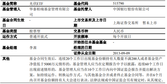 2020年12月1日,華泰柏瑞旗下中證光伏產業(yè)ETF正式發(fā)行,產品簡稱“光伏ETF”,基金代碼515790,認購代碼515793,僅發(fā)售1天,現(xiàn)金認購募集規(guī)模上限20億元?;鸸芾砣藶槿A泰柏瑞基金管理有限公司,基金托管人為中國銀行股份有限公司,基金登記機構為中國證券登記結算有限責任公司。