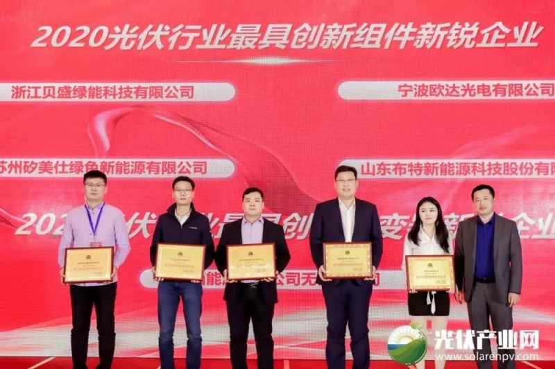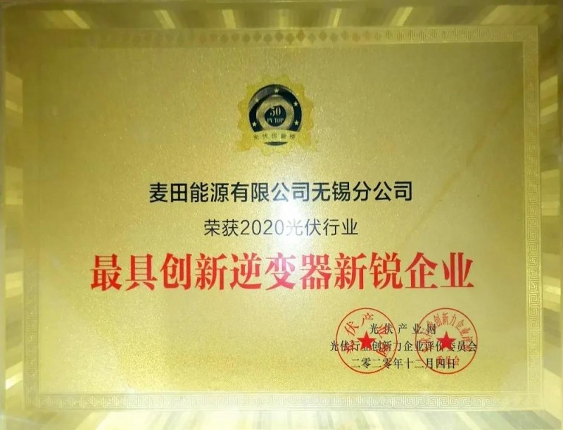 同期還舉行了一年一度的「PVTOP50」2020光伏創(chuàng)新榜榜單發(fā)布暨頒獎(jiǎng)典禮,麥田能源榮獲“2020光伏行業(yè)最具創(chuàng)新逆變器新銳企業(yè)”,載譽(yù)而歸。