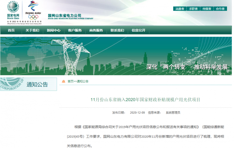 項目信息公布和報送有關(guān)事項的通知》(國能綜通新能[2019]45號)工作要求,國網(wǎng)山東電力有限公司對2020年11月份新增的戶用光伏項目進行了梳理,現(xiàn)將相關(guān)信息進行公布。