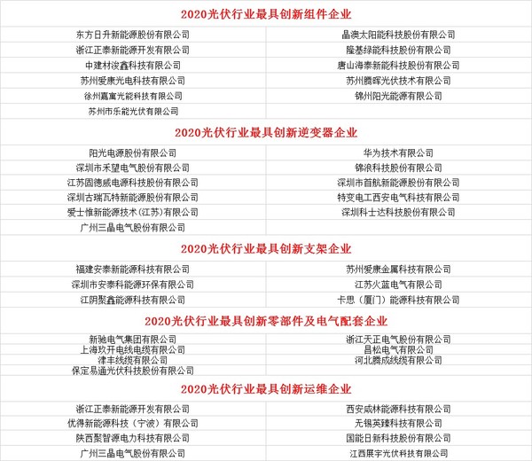 「PV TOP 50」2020光伏創(chuàng)新榜發(fā)布了“2020光伏行業(yè)最具創(chuàng)新力品牌服務商50強”榜單,并評選出:“2020光伏行業(yè)最具創(chuàng)新電池片/組件企業(yè)”、“2020光伏行業(yè)最具創(chuàng)新逆變器企業(yè)”、“2020光伏行業(yè)最具創(chuàng)新零部件及電氣配套企業(yè)”、“2020光伏行業(yè)最具創(chuàng)新支架企業(yè)”、“2020“光伏+”最具創(chuàng)新力企業(yè)(儲能、氫能、BIPV、金融、農(nóng)業(yè)、互聯(lián)網(wǎng)等)”、“2020光伏行業(yè)最具創(chuàng)新運維企業(yè)”、“2020光伏行業(yè)最具影響力戶用光伏系統(tǒng)”、“2020分布式光伏最具品牌影響力企業(yè)”等八大創(chuàng)新獎項。