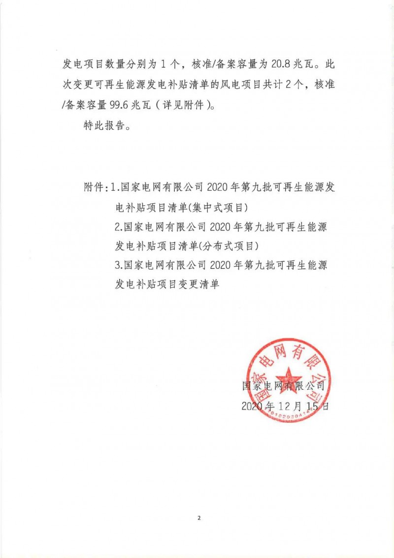 2020年12月15日,我公司已將完成公示的第九批次可再生能源發(fā)電項目補貼項目清單上報國家主管部門,后續(xù)將陸續(xù)完成首批(詳見財辦建〔2020〕6號有關(guān)規(guī)定)補助項目清單審核發(fā)布工作。第九批次項目清單及首批后續(xù)項目審核進展情況,請登錄新能源云平臺查詢。