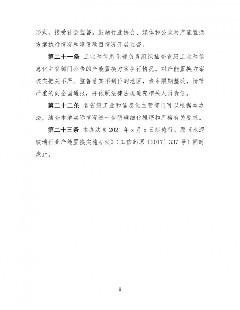 為深入推進水泥玻璃行業(yè)供給側(cè)結構性改革,更好的指導各地開展產(chǎn)能置換,鞏固化解過剩產(chǎn)能成效,工業(yè)和信息化部對現(xiàn)行的《水泥玻璃行業(yè)產(chǎn)能置換實施辦法》(工信部原〔2017〕337號)進行修訂,形成了《水泥玻璃行業(yè)產(chǎn)能置換實施辦法(修訂稿)》(見附件1)。