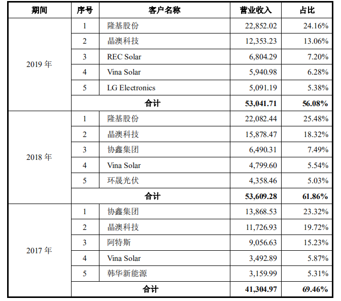 這家即將進(jìn)入科創(chuàng)板的企業(yè)第一大客戶就是隆基股份。2019年和2018年,隆基向明冠新材的采購(gòu)額分別高達(dá)2.2852億和2.2億元,占比24.16%和25.48%。VinaSolar(下稱“越南光伏”)也是明冠新材連續(xù)多個(gè)年度的重量級(jí)客戶。由于越南光伏已被隆基收購(gòu),因此如果隆基系對(duì)明冠新材在今年的整體采購(gòu)額比重調(diào)整不大的話,2020年對(duì)于這家背板企業(yè)來(lái)說(shuō),隆基系仍是明冠新材的首位大客戶。