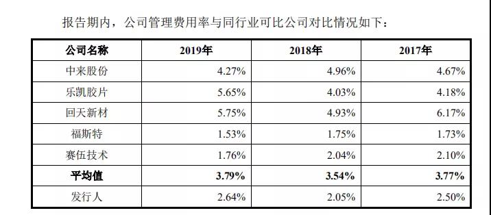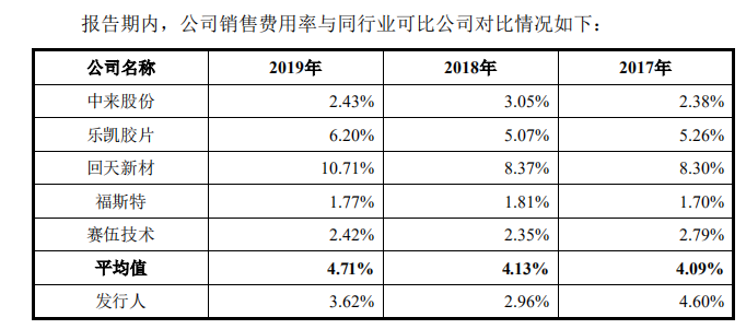 銷售費(fèi)用率方面,2019年明冠新材的比值是3.62%,要高于賽伍技術(shù)、福斯特和中來(lái)股份,但是低于4.71%的行業(yè)均值。