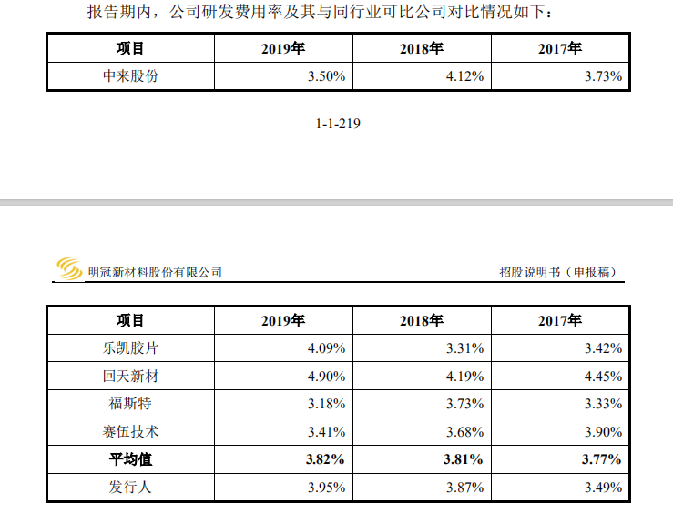 研發(fā)費(fèi)用方面,明冠新材于去年的比值高于平均水平,但相比回天新材和樂(lè)凱膠片的4%以上,仍然有一定差距。