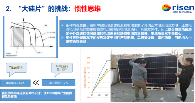 除了各環(huán)節(jié)降低制造成本之外,大組件還可以通過低電壓提高組串30%的功率,大幅降低LCOE成本,但同時外界也常誤認為組件電流增大后更容易形成熱斑。