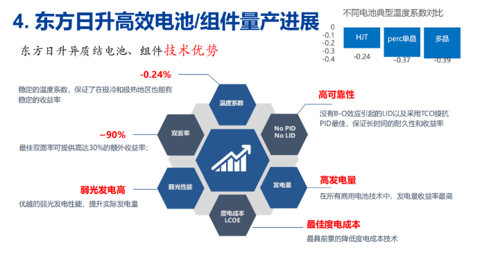 2019年12月12日,東方日升發(fā)布了業(yè)內(nèi)首款半片異質(zhì)結(jié)組件,效率高達21.9%,于2020年2季度在中廣核白城25MW項目現(xiàn)場并網(wǎng),該款組件溫度系數(shù)-0.24%/℃,只有晶硅電池溫度系數(shù)的一半左右(-0.39 %/ ℃),并且具備雙面率高(約90%)、高可靠(無光致衰減)、高發(fā)電量、弱光發(fā)電等特性,助力客戶實現(xiàn)最優(yōu)度電成本。