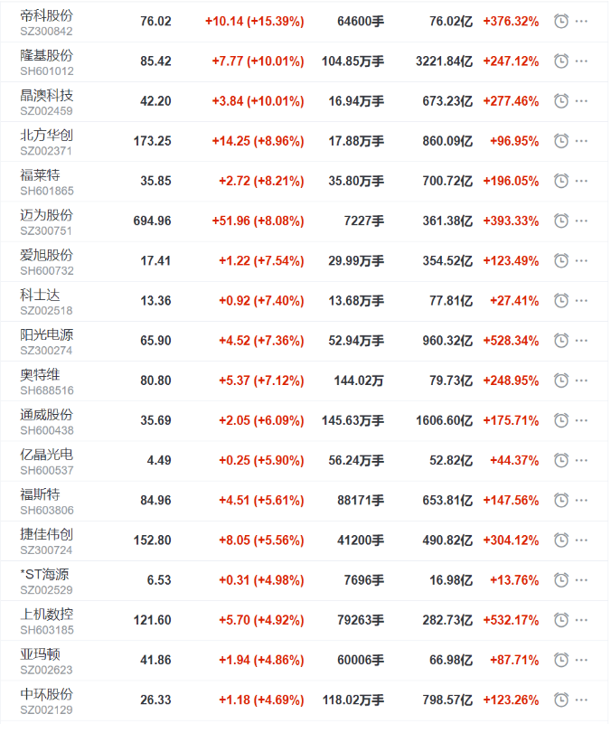 隆基股份跳空高開8.18%,一口氣沖上3000億市值。截至午間收盤,隆基股份漲停,報(bào)收85.42元/股,成交74.21億元,總市值3221億元,較前一交易日暴漲292億元,股價(jià)和市值創(chuàng)出歷史新高。