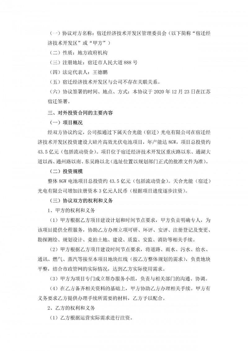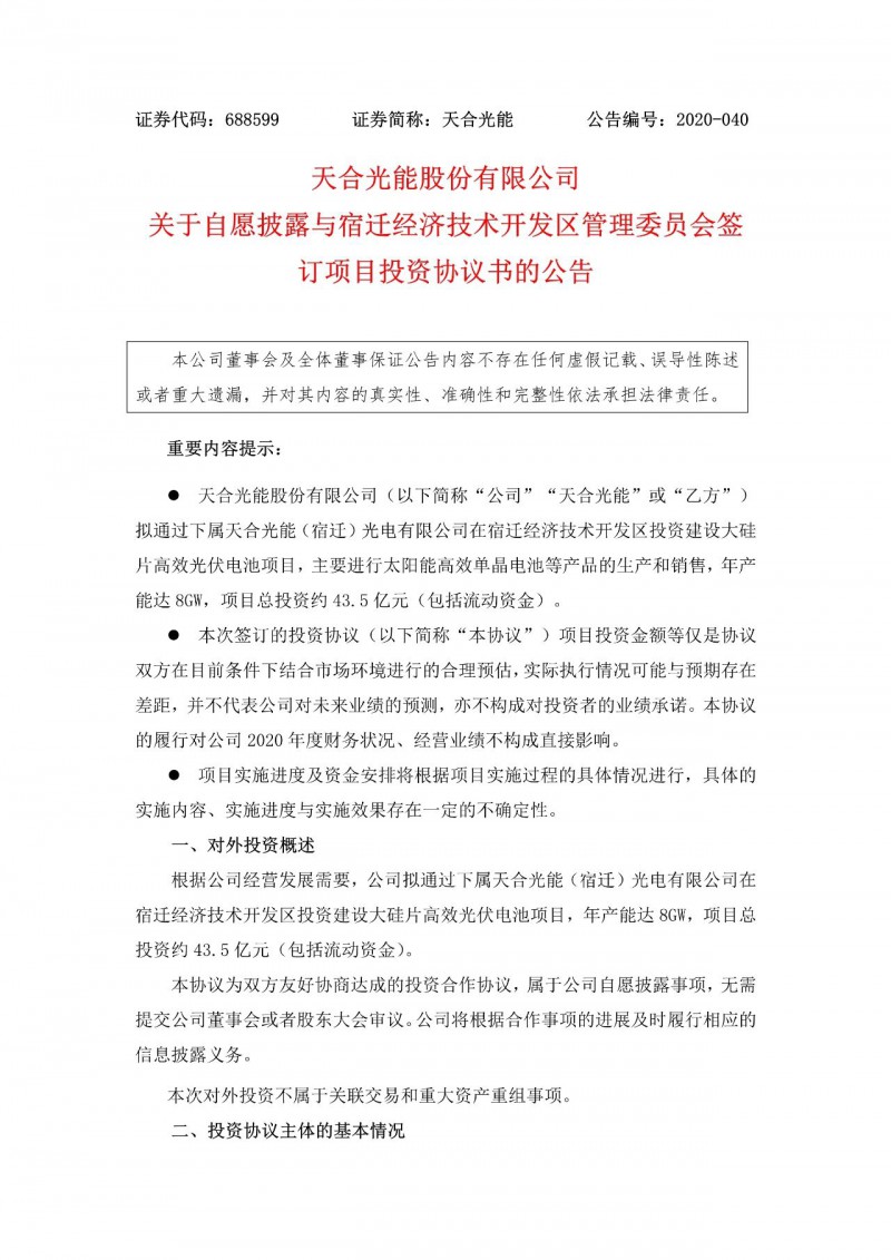 天合光能公告,公司擬通過下屬天合光能(宿遷)光電有限公司,在宿遷經(jīng)濟(jì)技術(shù)開發(fā)區(qū)投資建設(shè)大硅片高效