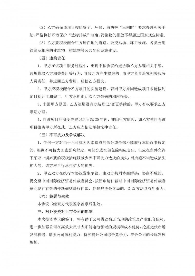 公司就該項(xiàng)目與宿遷經(jīng)濟(jì)技術(shù)開發(fā)區(qū)簽訂了投資協(xié)議,將有助于公司借助宿遷當(dāng)?shù)氐恼呒爱a(chǎn)業(yè)配套優(yōu)勢,將進(jìn)一步加強(qiáng)公司在高效大尺寸太陽能電池領(lǐng)域的規(guī)模和成本優(yōu)勢,搶抓