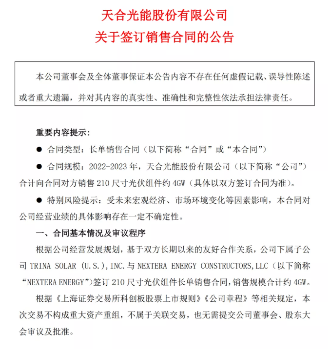 根據(jù)公告,NEXTERA ENERGY母公司為美國十大電力供應(yīng)商之一的NEXTEAR ENERGY,INC.天合光能表示,本次長單銷售合同簽訂符合公司未來經(jīng)營發(fā)展規(guī)劃,有利于保障公司大尺寸組件的穩(wěn)定銷售。